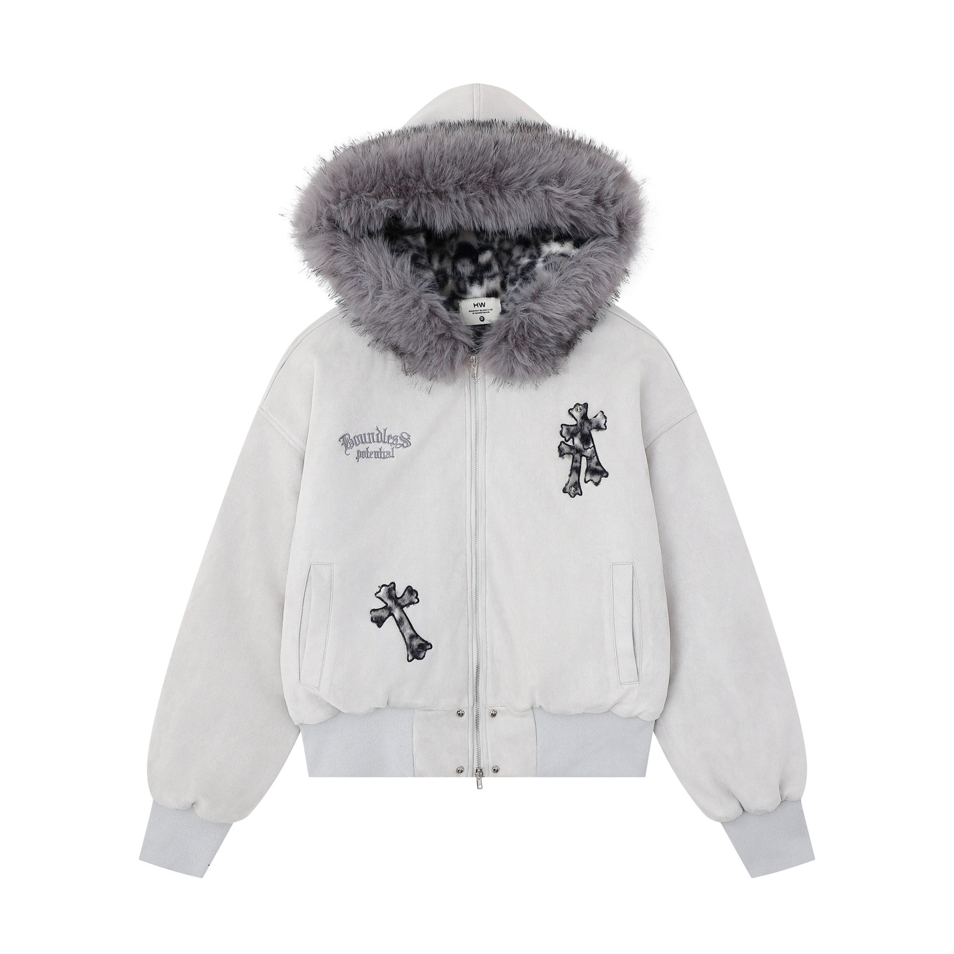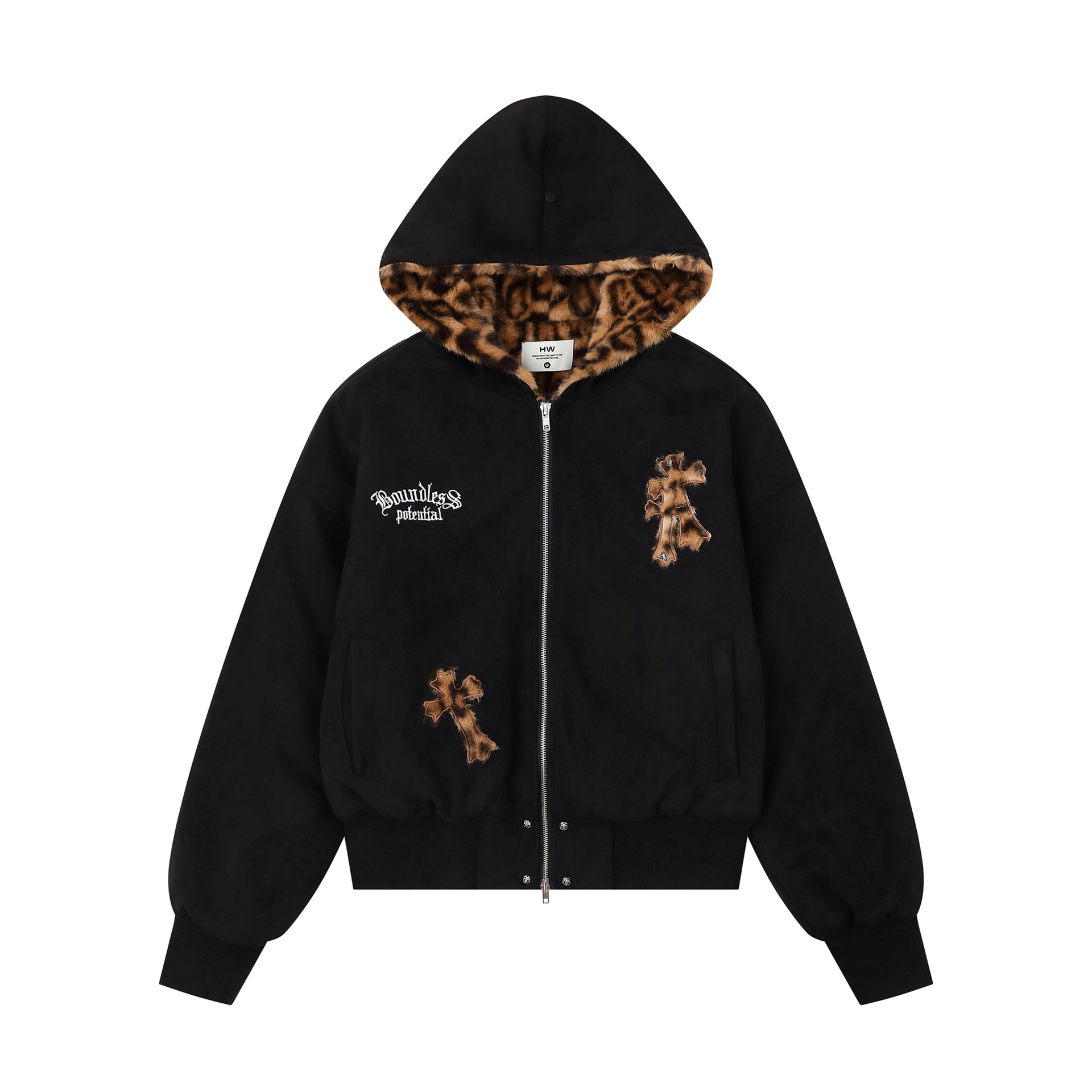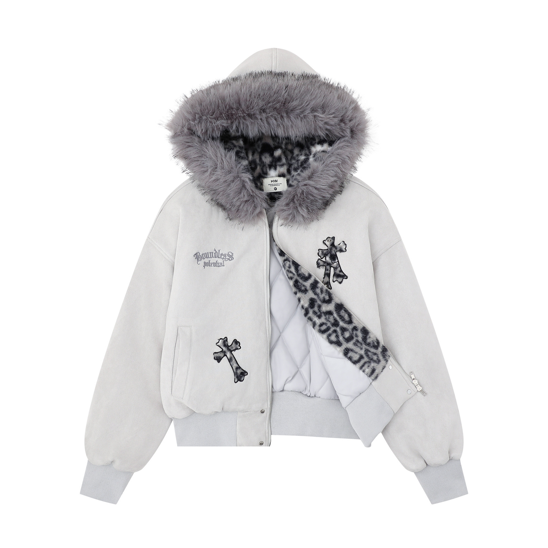 洗練されたクロスデザインが特徴のフェイクファーフードジャケット。上質なフェイクファー素材が暖かさと高級感を兼ね備え、季節の変わり目から冬まで活躍します。フード付きで顔周りをしっかり保温でき、モダンなデザインはカジュアルからきれいめまで幅広いスタイリングに対応。動物性素材を使用しないエシカルな選択肢として、ファッション性と機能性を両立させた一枚です。