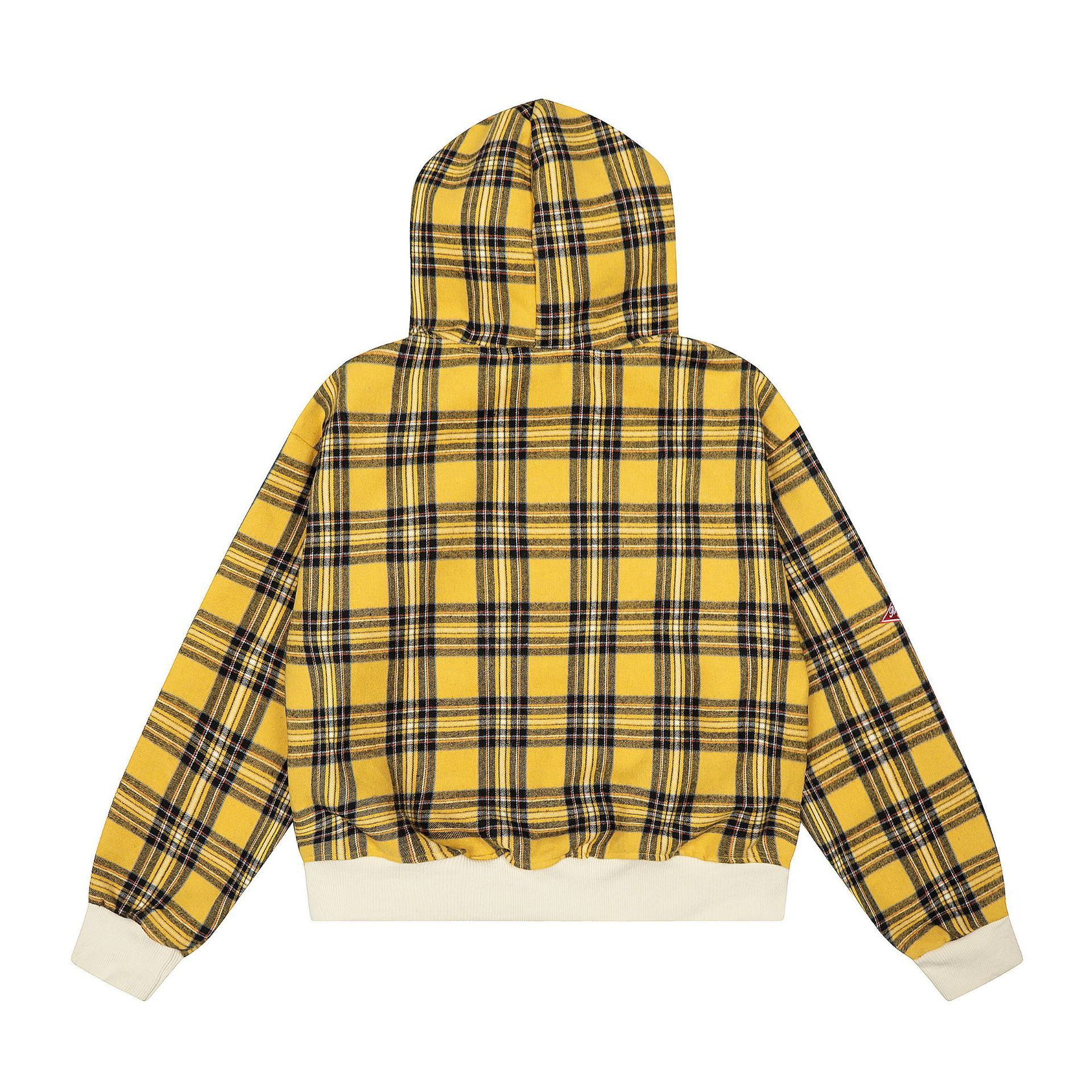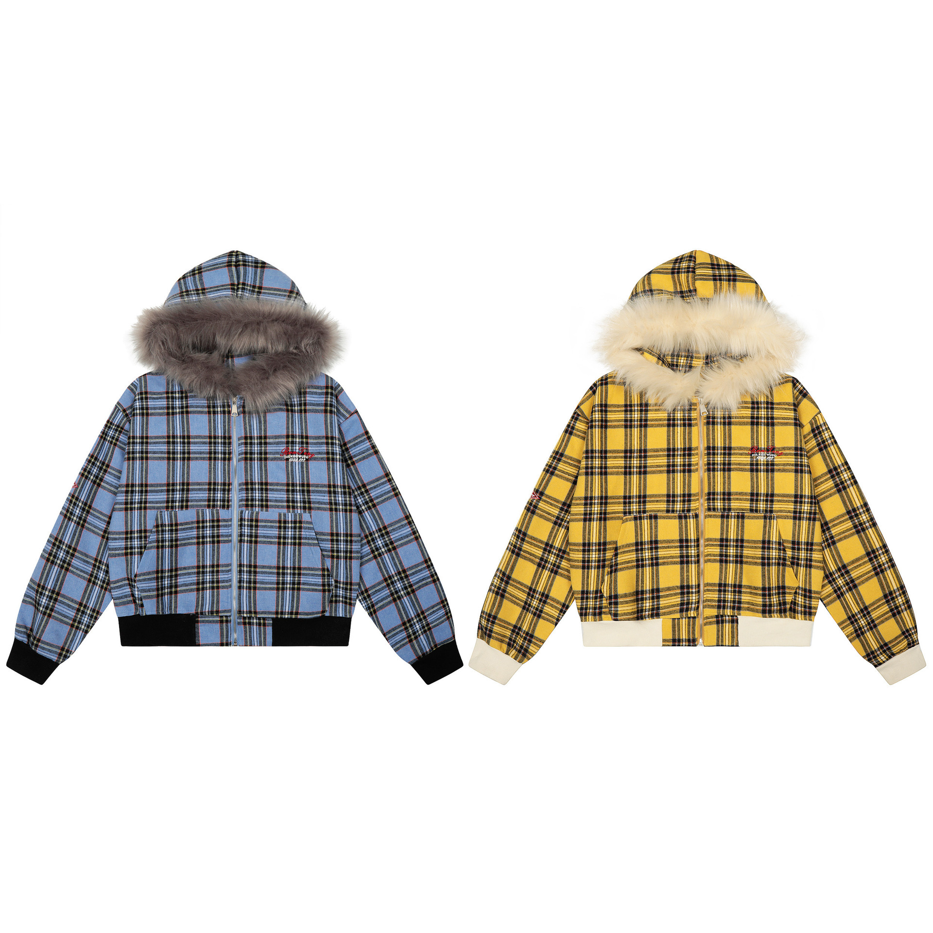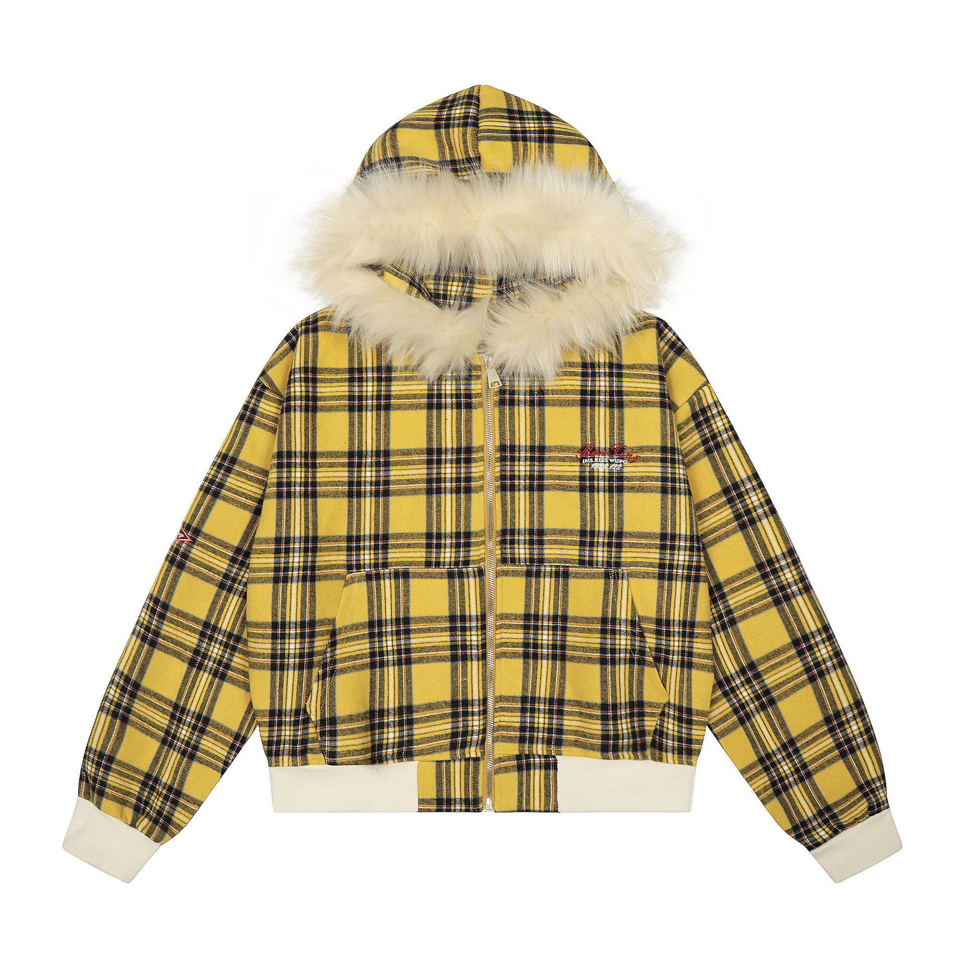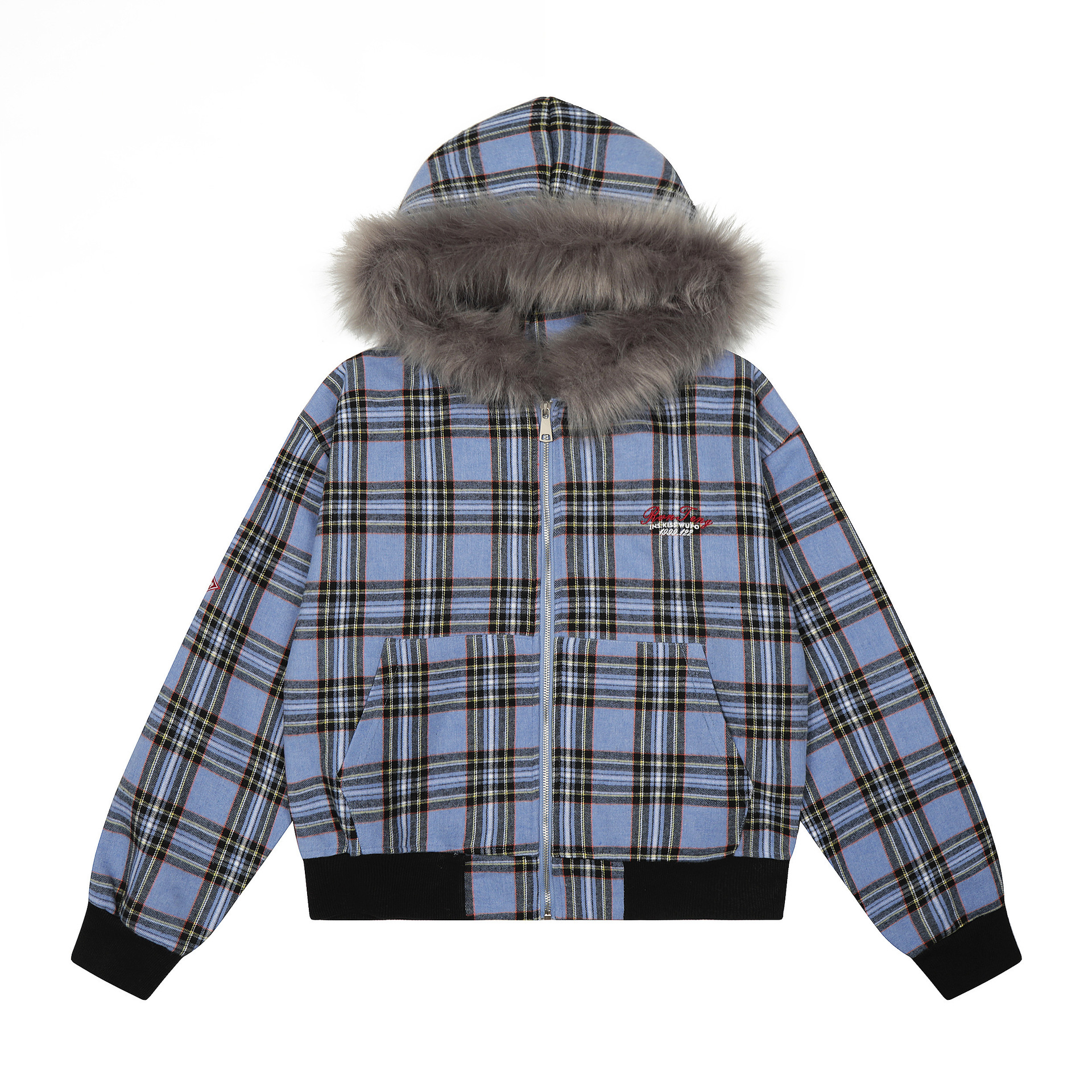 チェック柄ファーフードワンポイント刺繍ロゴジップアップジャケット/2color/cm0013