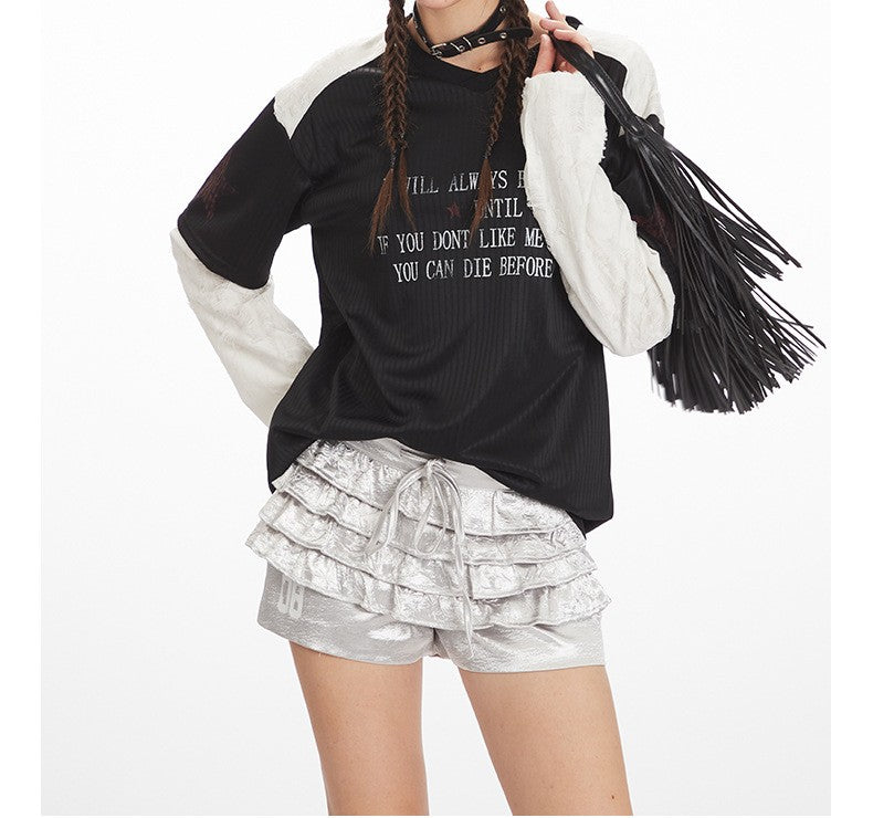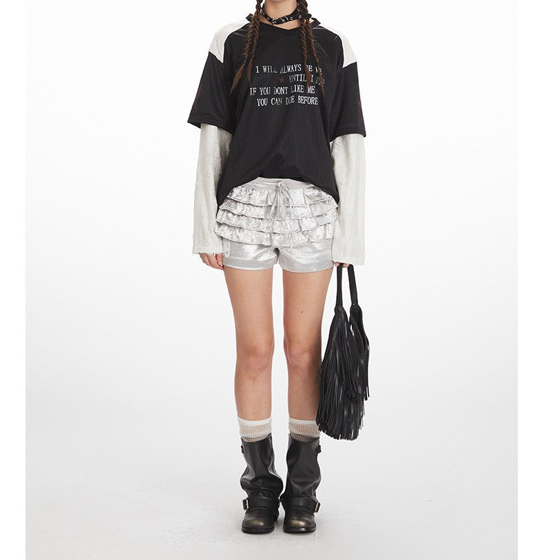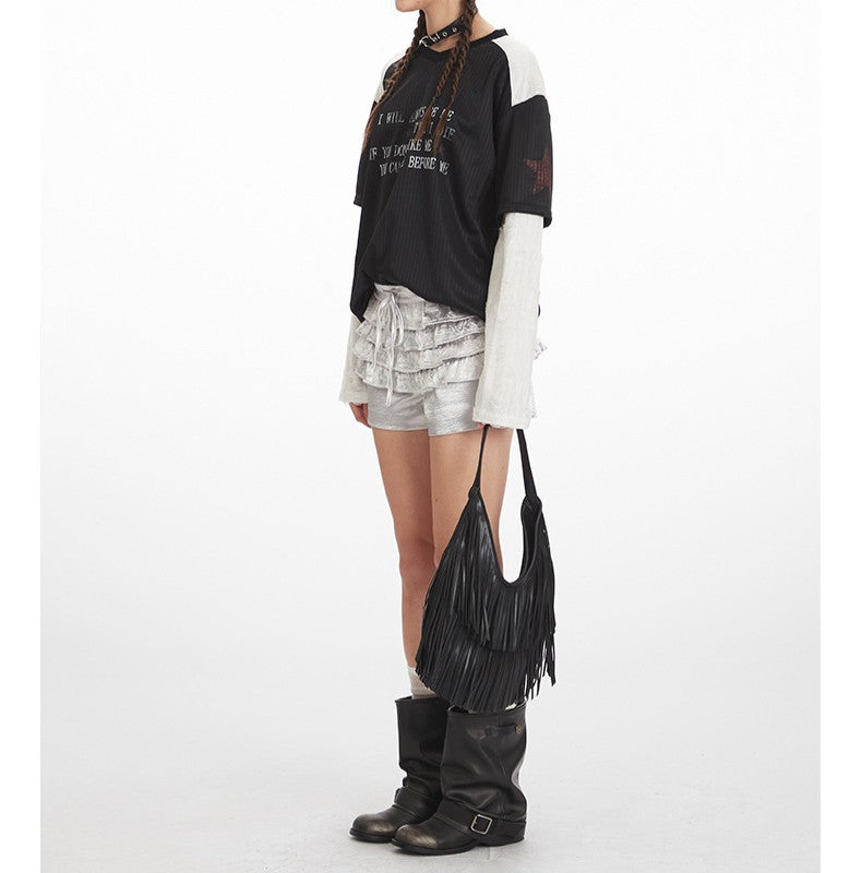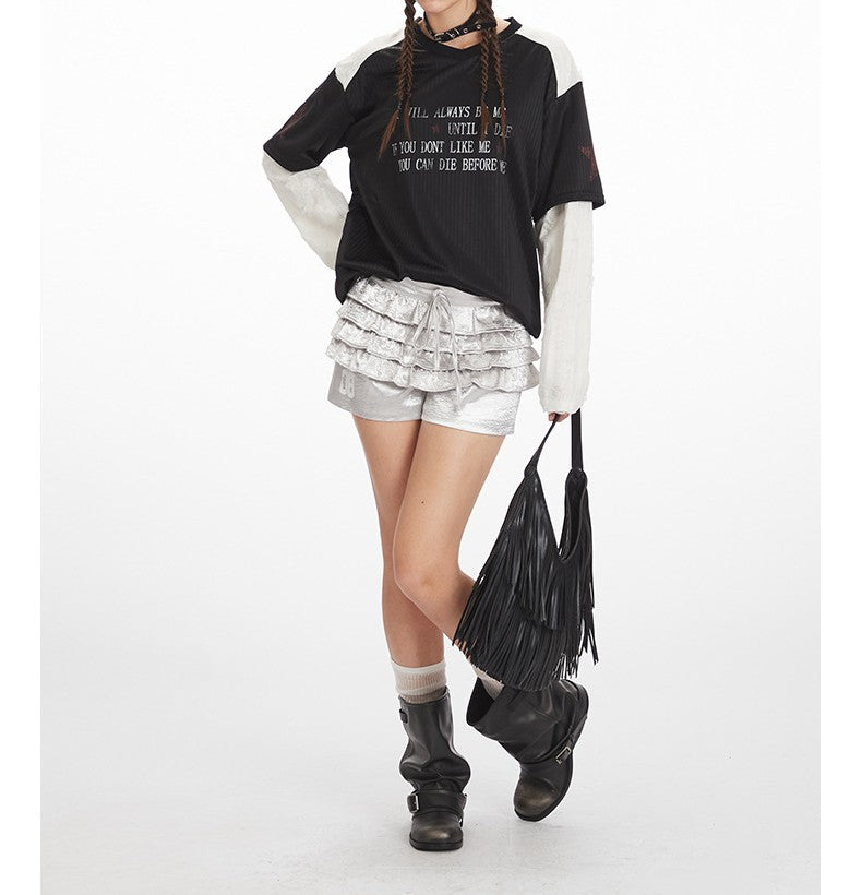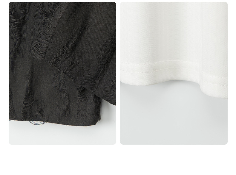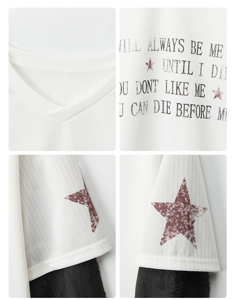 VネックコントラストダメージフェイクレイヤードTシャツ/2color/cm0045