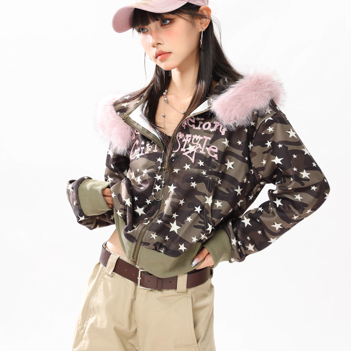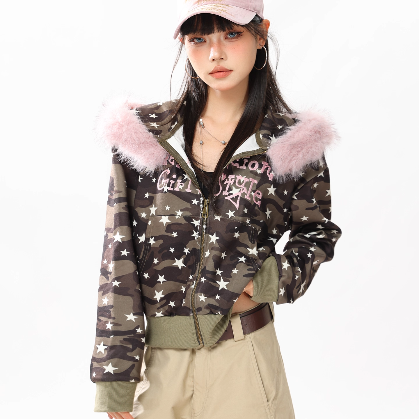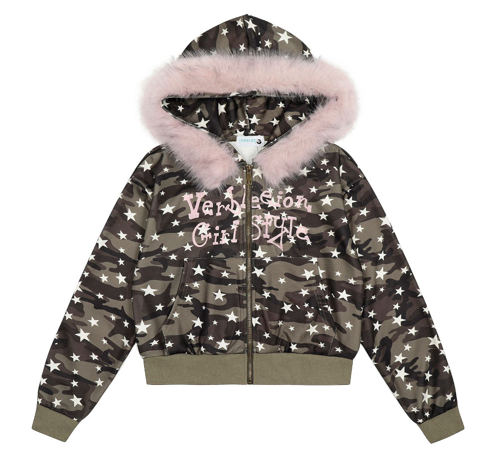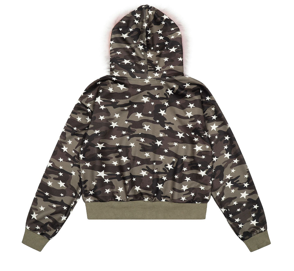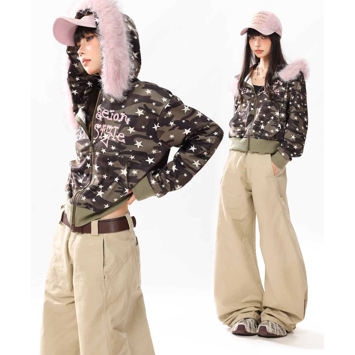 ファー付き迷彩スタープリントジップアップフードパーカー/cm0049