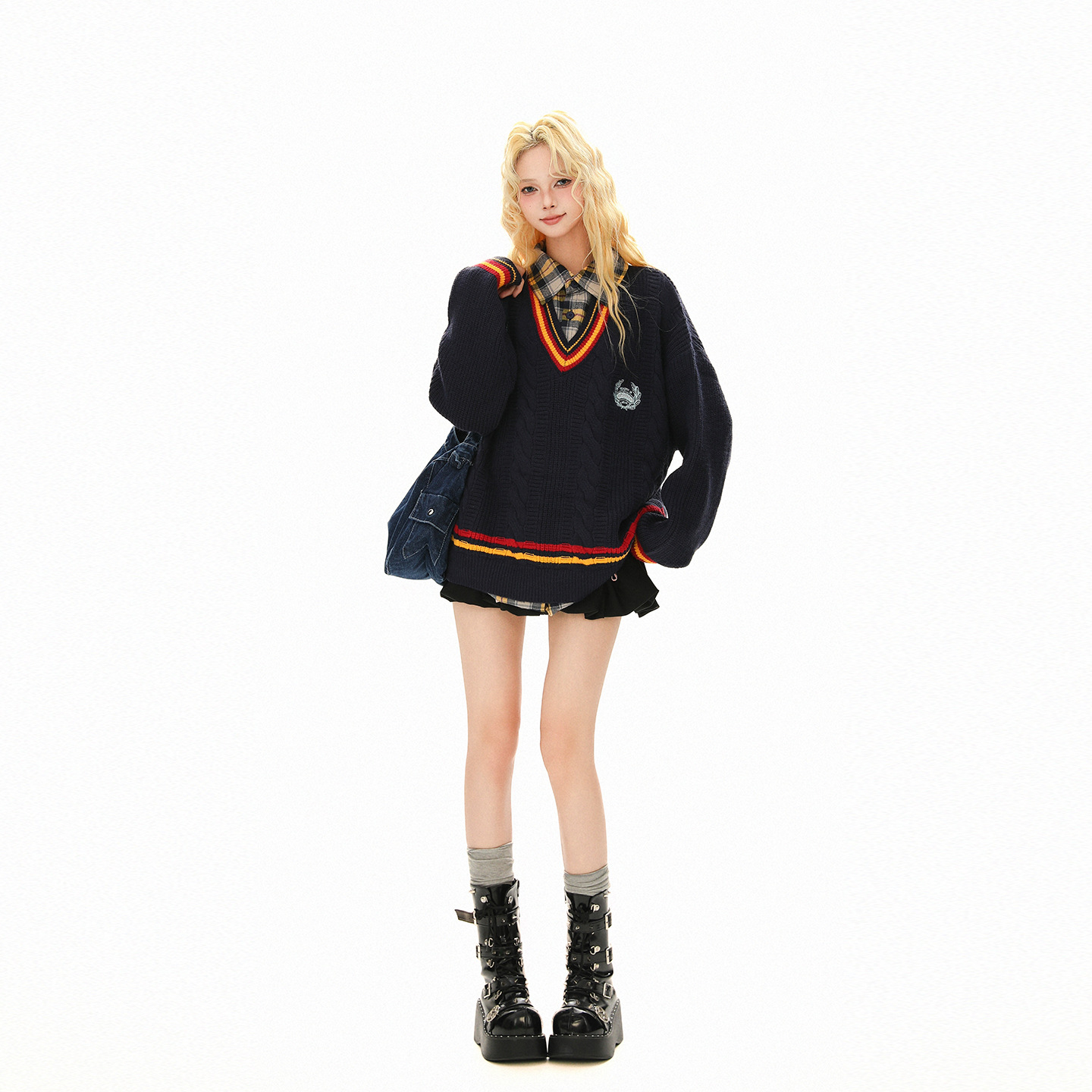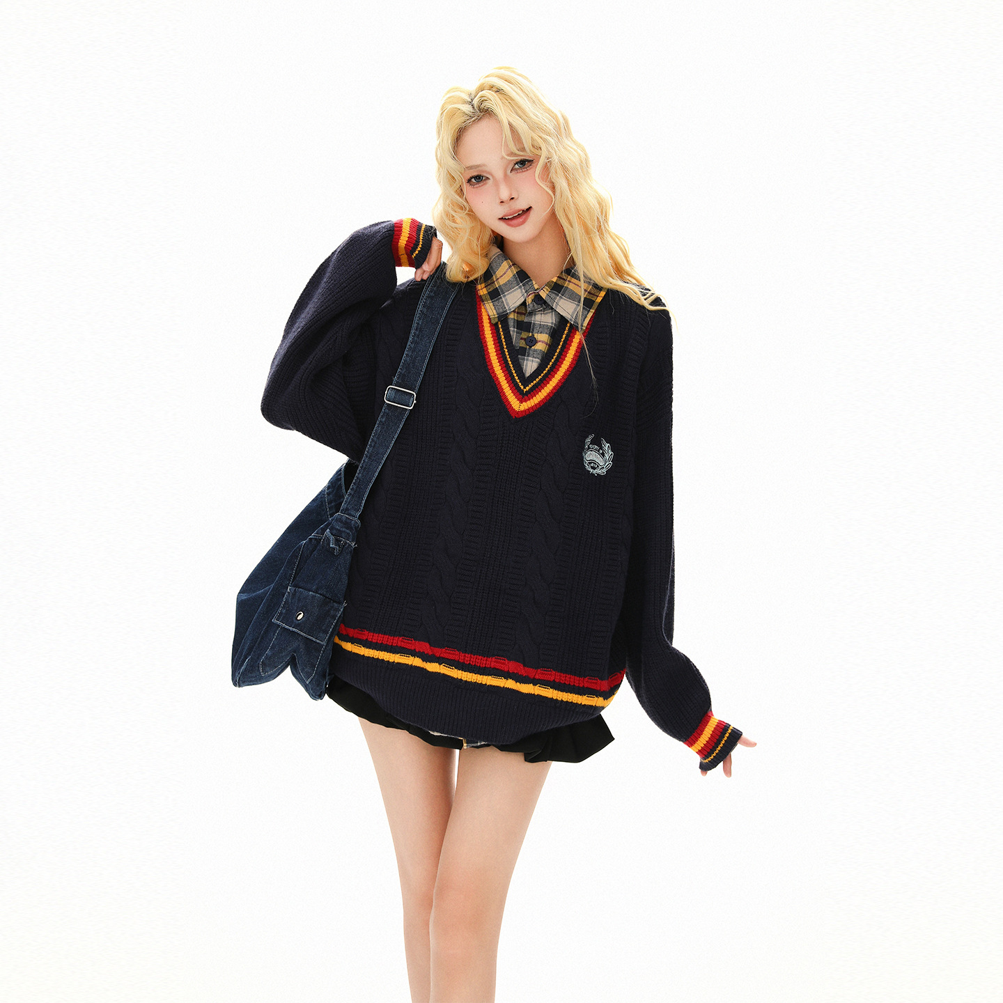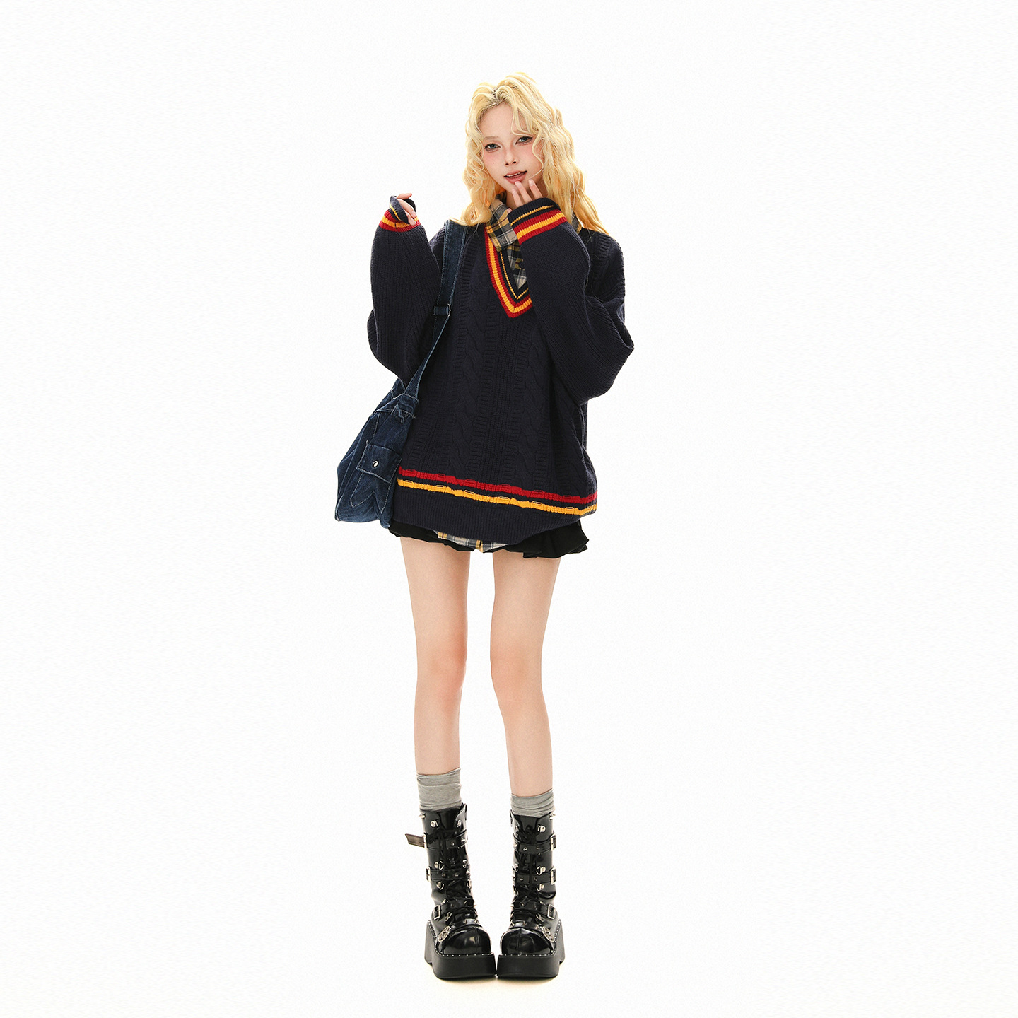 シャツフェイクレイヤード/ラインネック/ワンポイントケーブル編みデザインニット/cm0057