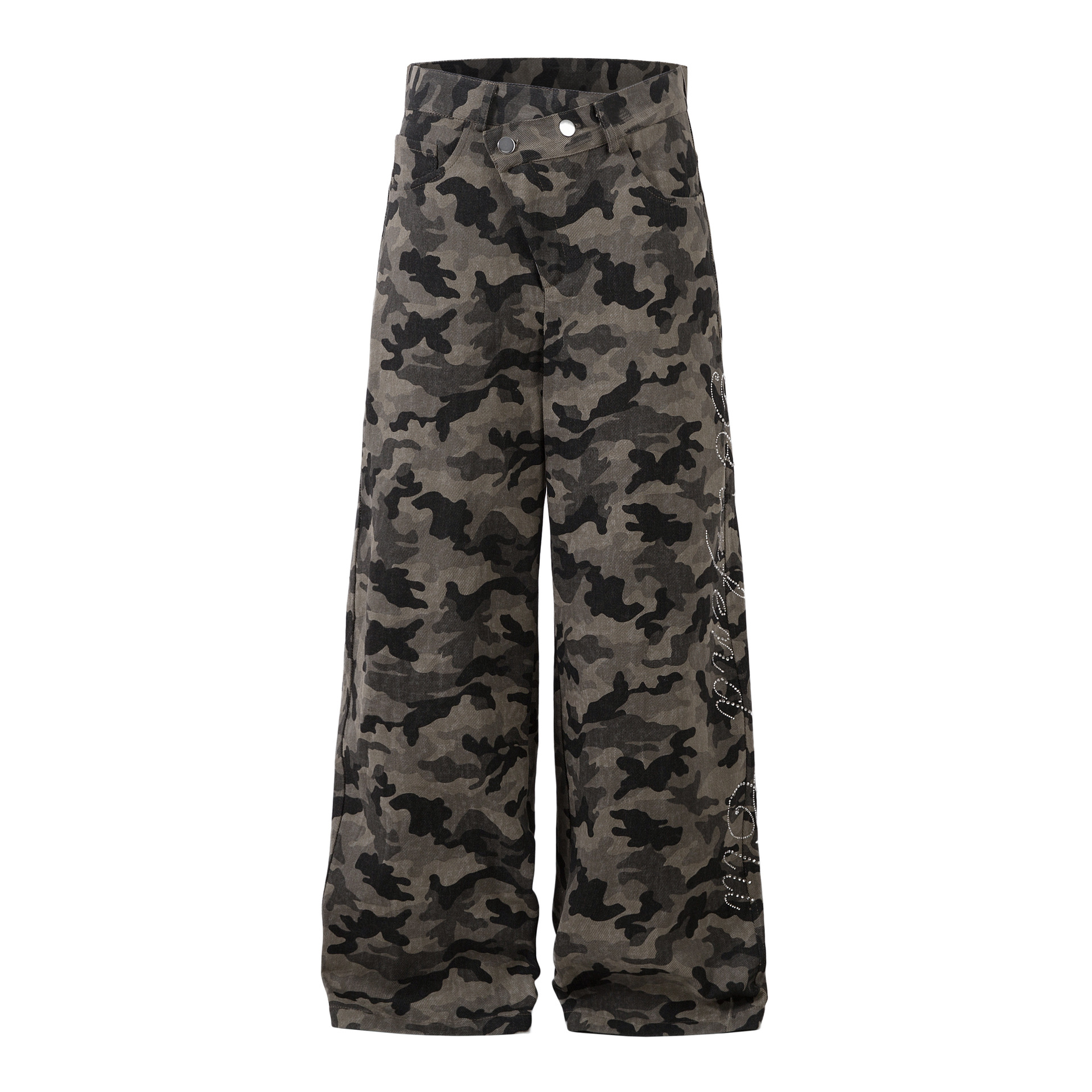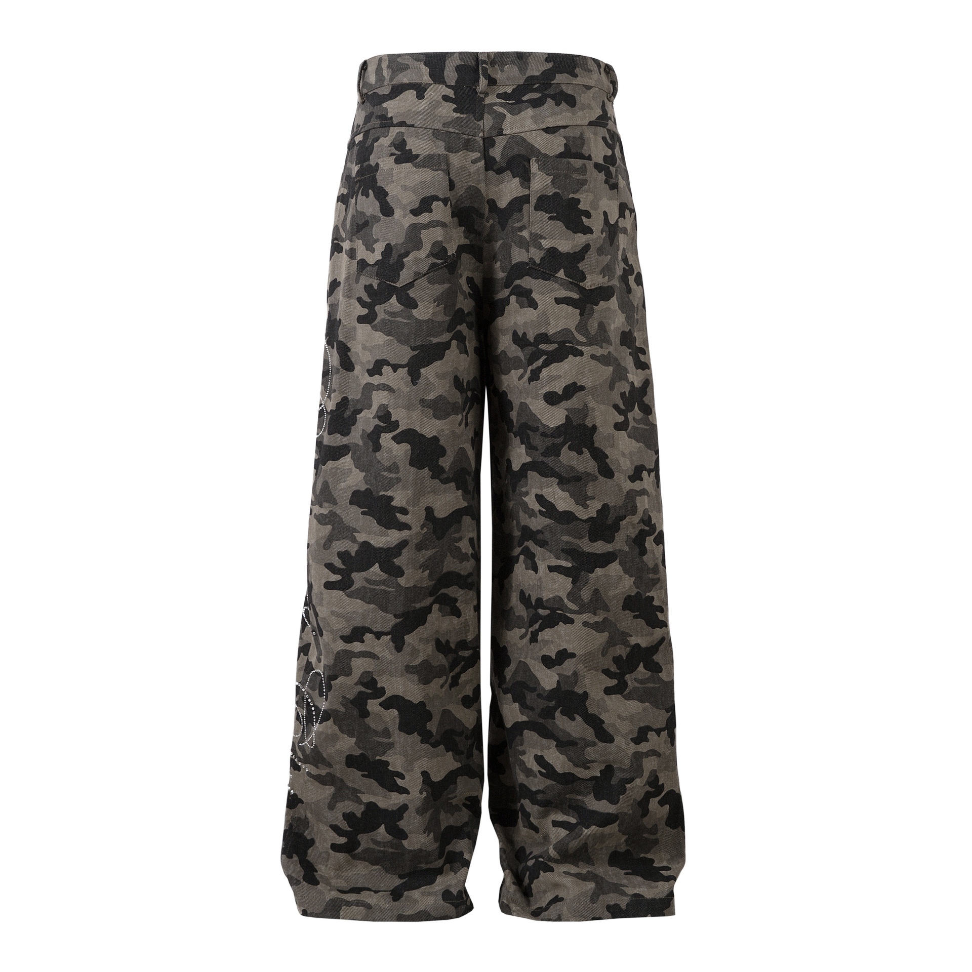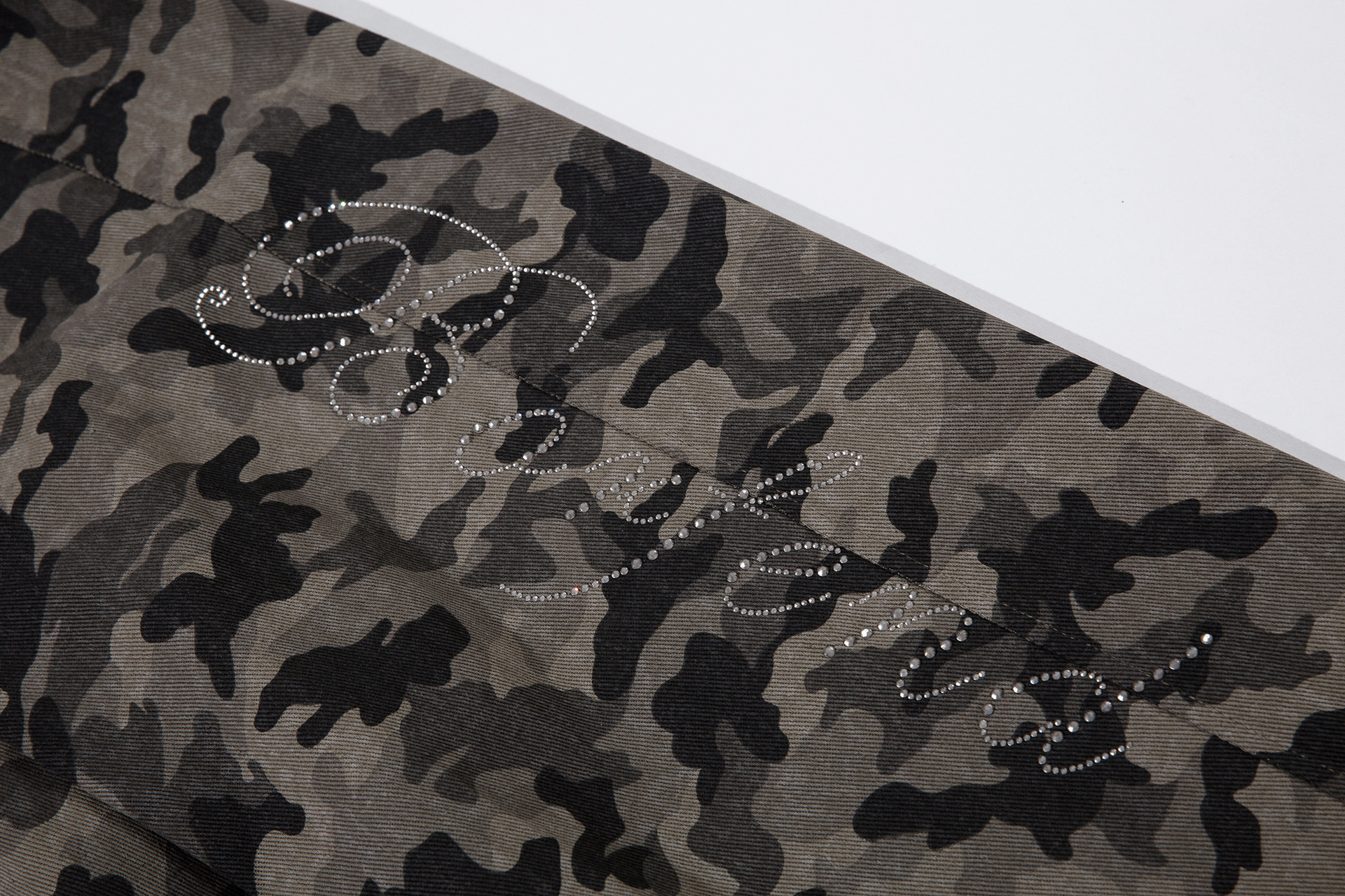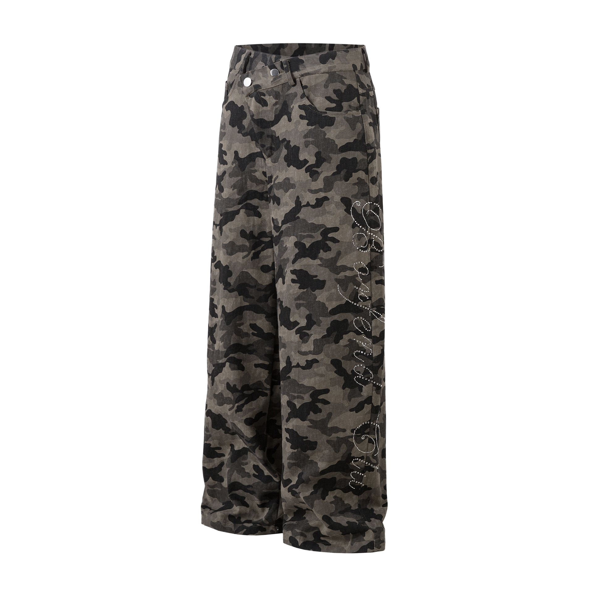 カモフラ柄ビジューアルファベットデザインデニムパンツ/cm0091