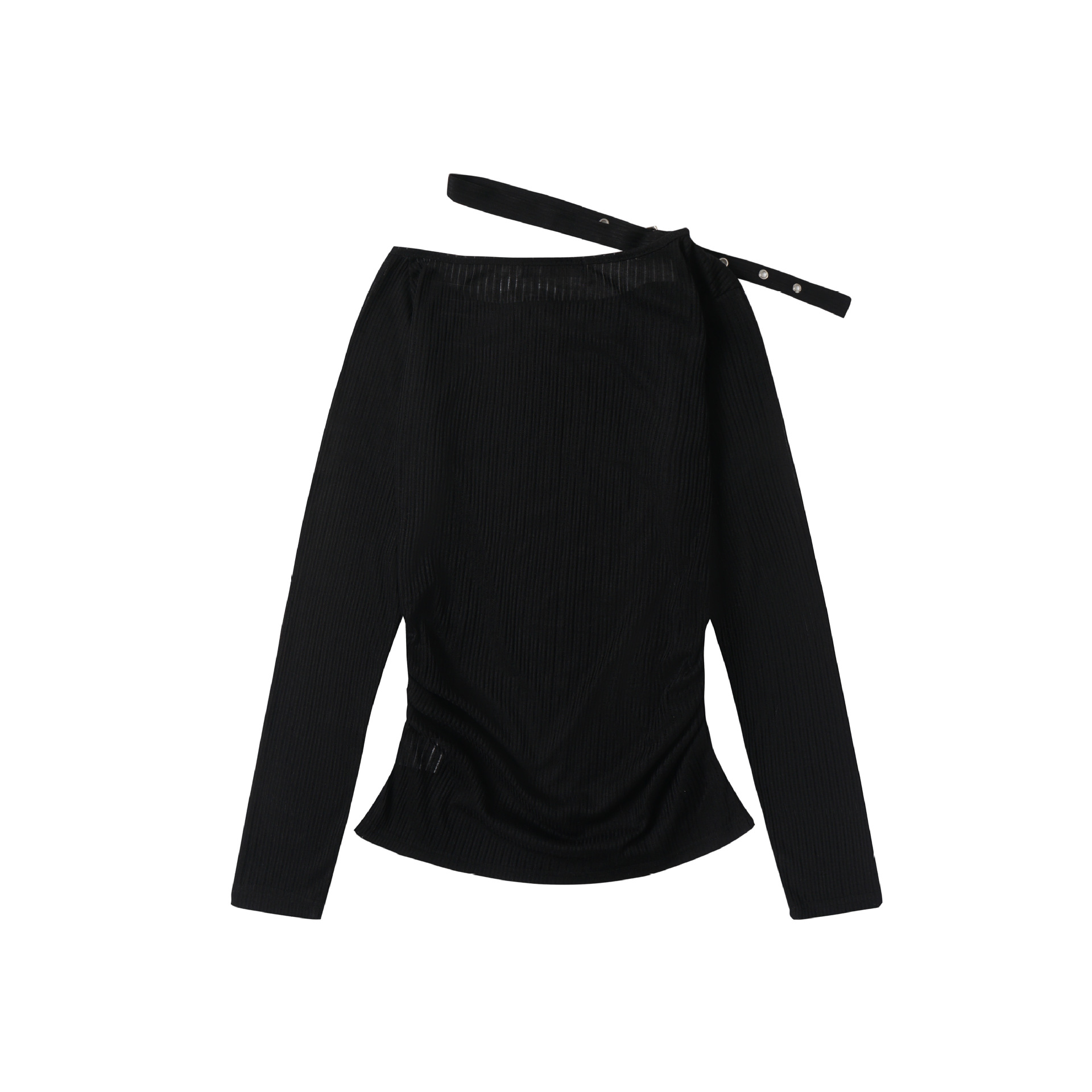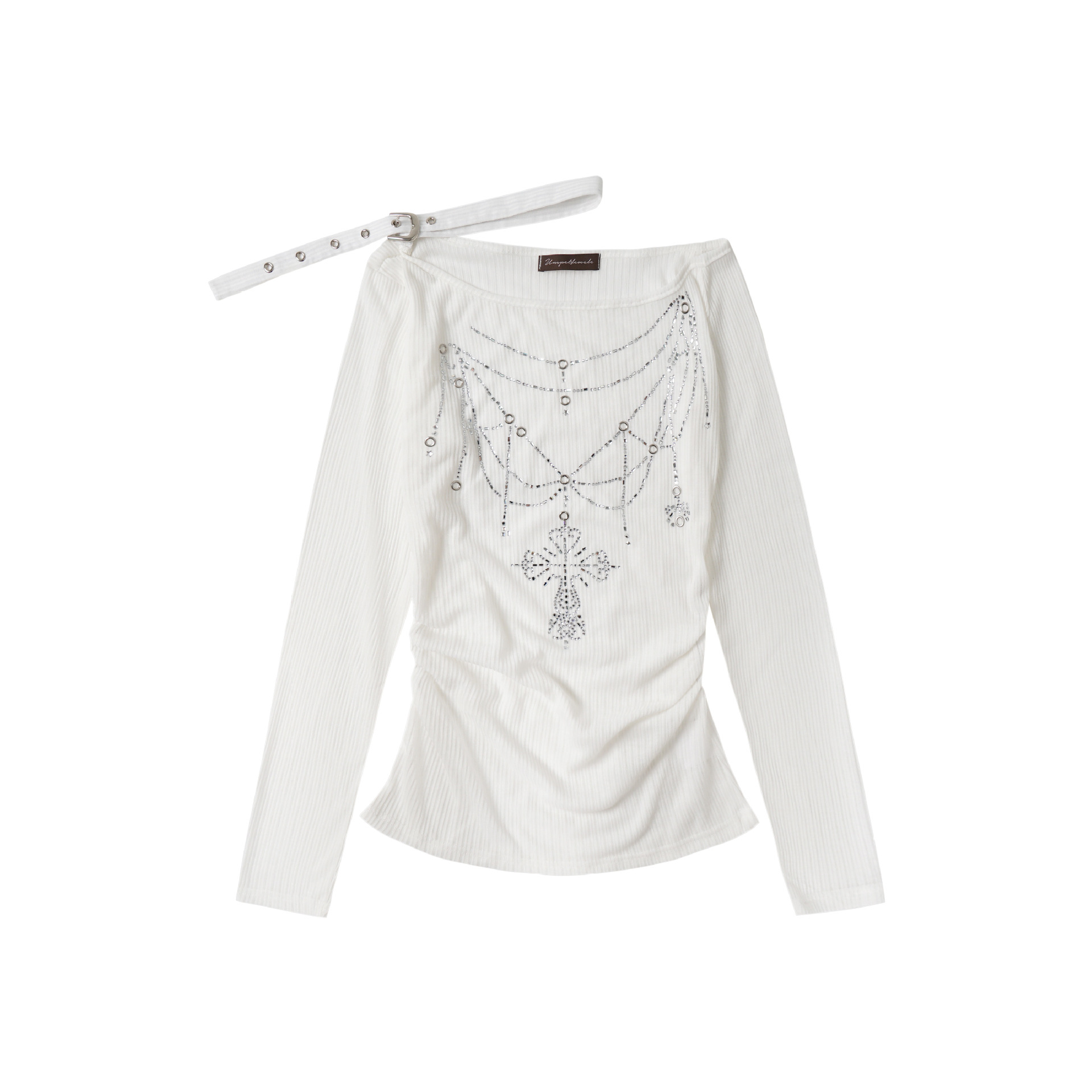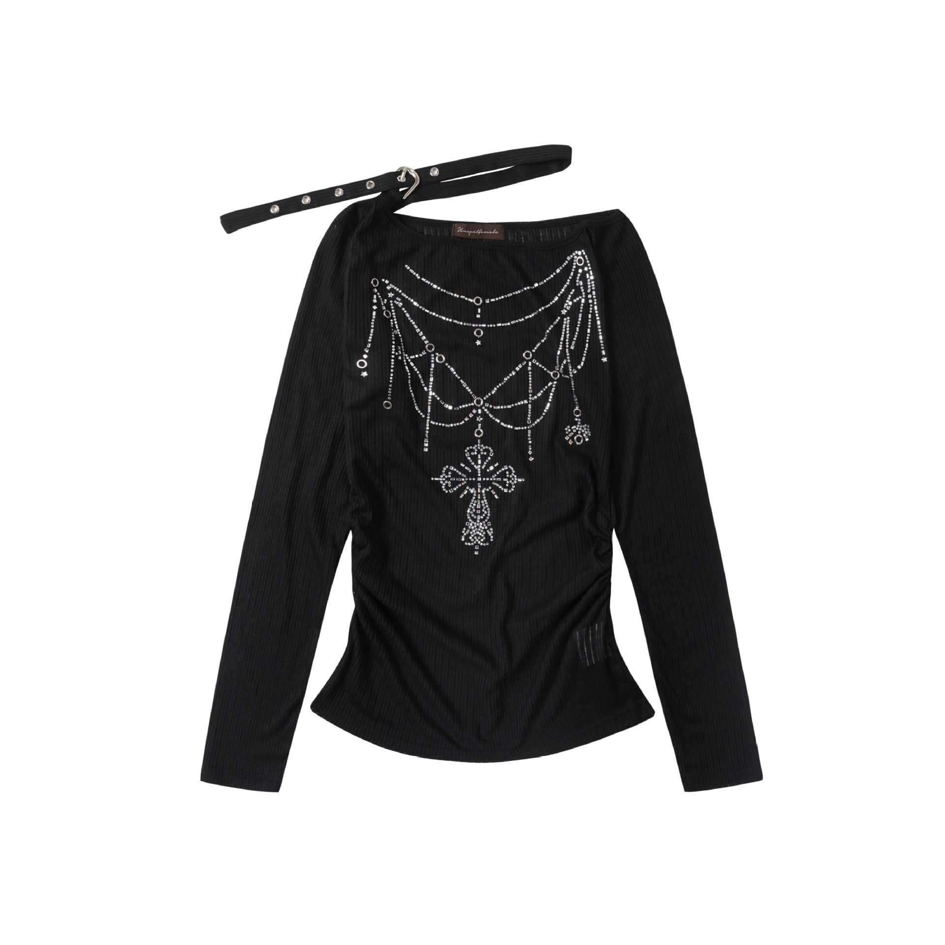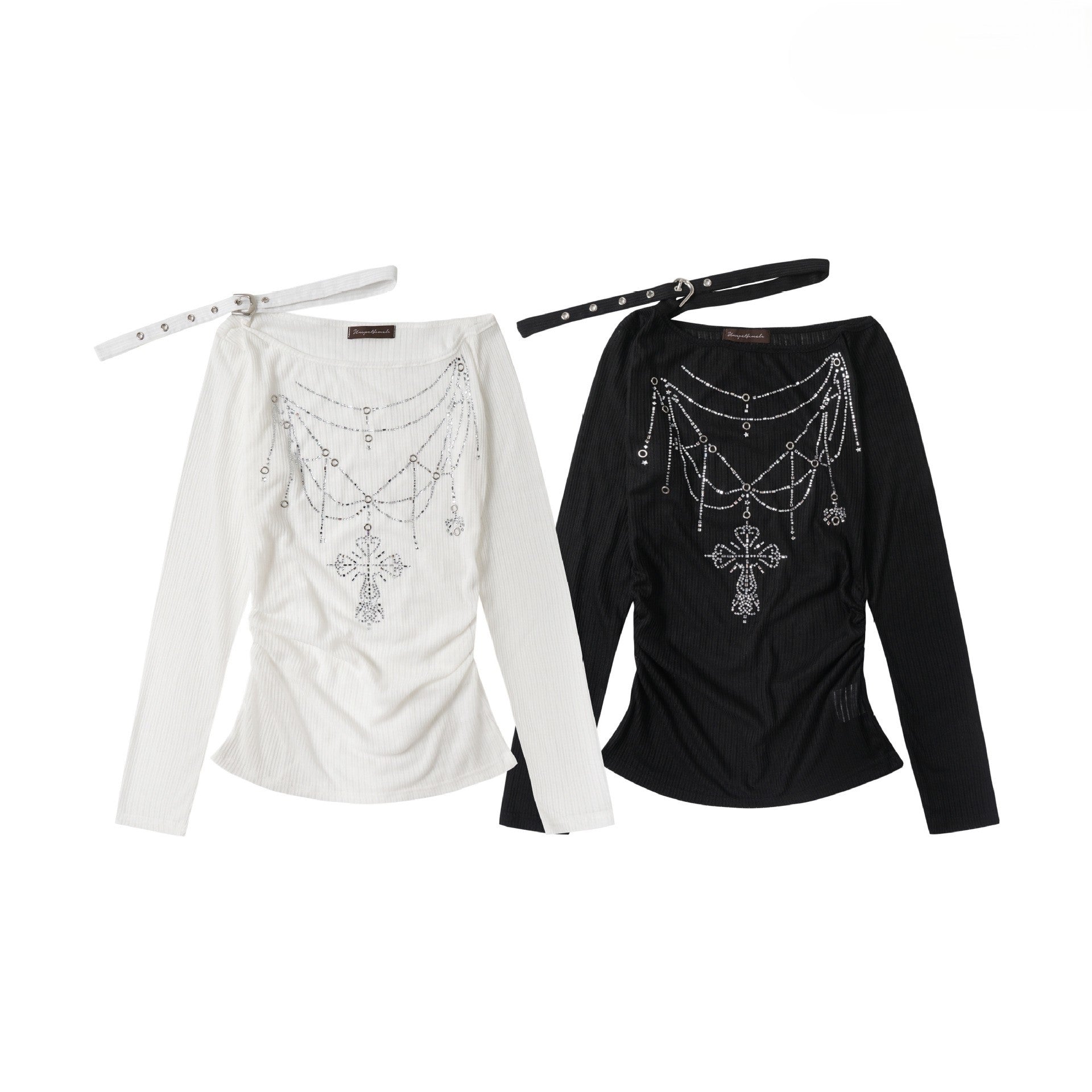 ベルトデザインラインストーン長袖トップス/2color/cm0156